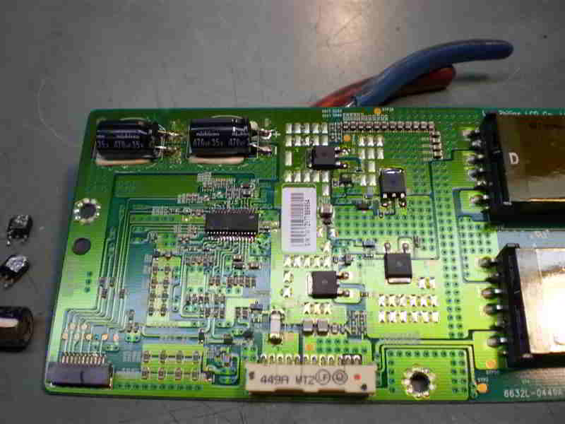 The pictures show: 1. This is how I remove those pesky MOSFETs. You are seeing more than $900.00 worth of soldering equipment in action, and that’s what it takes to remove those parts without damaging the board. This picture shows a board that is not in this set, but is a good shot of me at work!